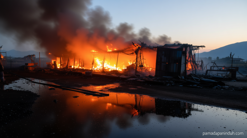Kebakaran tersebut terjadi sekitar pukul 20.30, dimulai dari salah satu kios yang terletak di bagian tengah kompleks. Api dengan cepat menyebar ke area sekitarnya, memakan korban besar dalam waktu singkat. Petugas pemadam kebakaran setempat, yang diterjunkan segera setelah kejadian, berjuang keras untuk memadamkan api sebelum merambat ke bangunan lain.